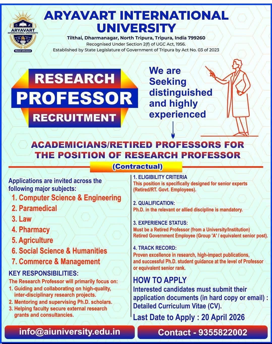 Aryavart International University invites applications from retired professors and senior academicians for Research Professor posts on contractual basis across multiple disciplines. Apply before 20 April 2026.