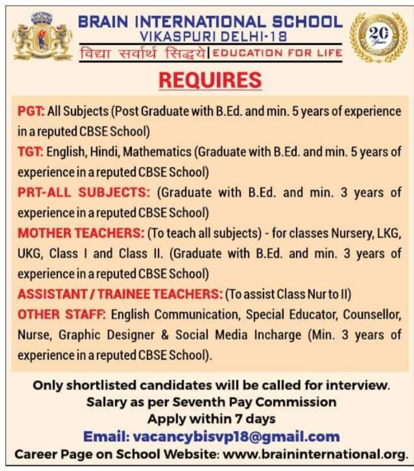 Brain International School, Vikas Puri, Delhi invites applications for PGT, TGT, PRT, Mother Teachers, Assistant Teachers, and other school staff positions. Eligible candidates can apply via email within 7 days. Salary as per 7th Pay Commission.