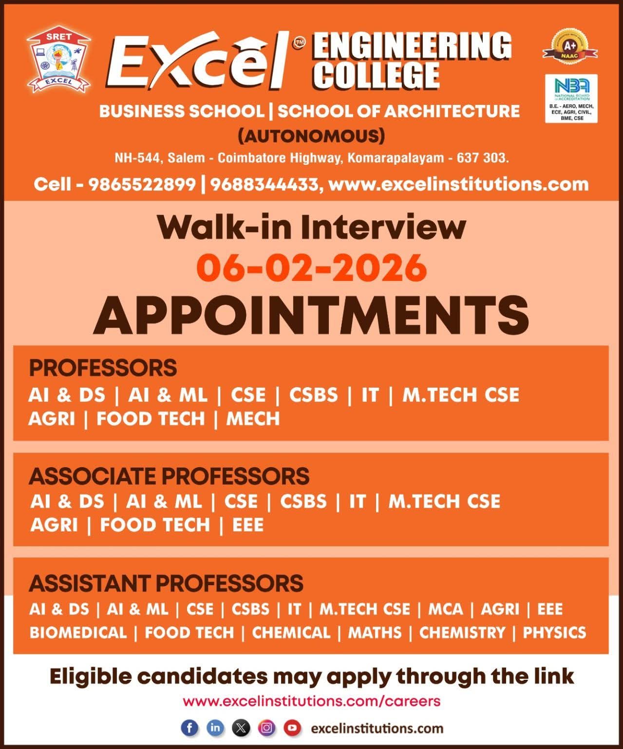 Excel Engineering College, an Autonomous Institution under SRET – Excel Group, accredited with NAAC A+ and NBA, invites applications from qualified and experienced faculty members through a Walk-in Interview for various Professor, Associate Professor, and Assistant Professor positions.