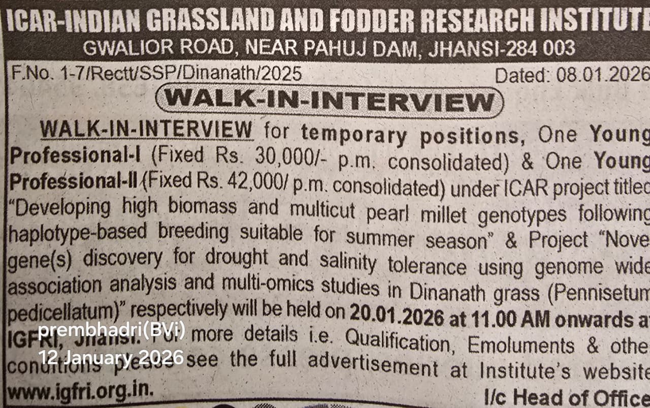 ICAR-Indian Grassland and Fodder Research Institute (IGFRI), Jhansi invites candidates for Walk-in-Interview 2026 for Young Professional-I & Young Professional-II posts under ICAR projects. Check qualification, salary, interview date & venue.