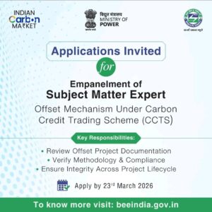 The Ministry of Power, Government of India, under the Bureau of Energy Efficiency (BEE), has invited applications for the empanelment of Subject Matter Experts (SMEs) under the Indian Carbon Market (ICM).