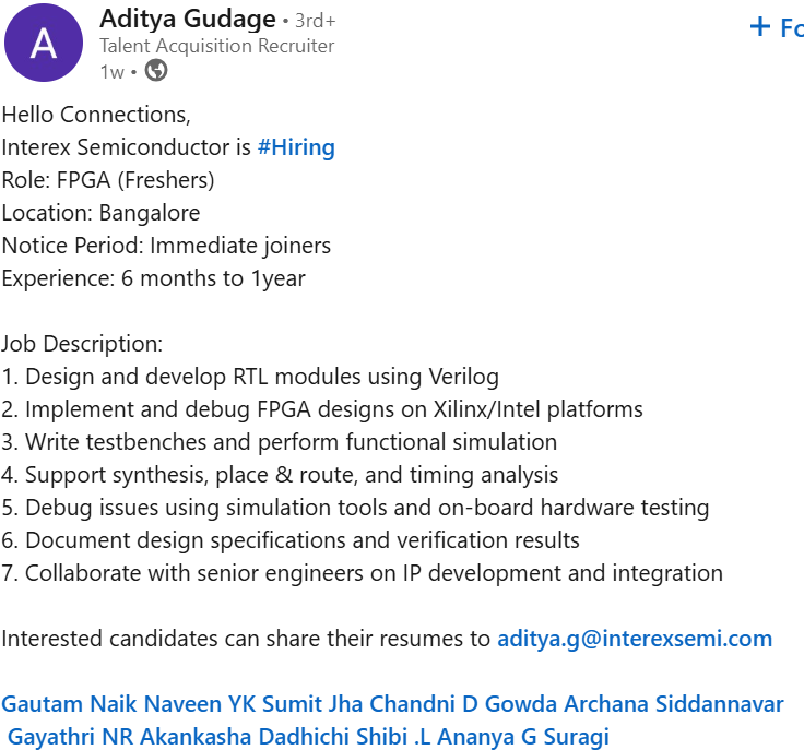 Interex Semiconductor is currently hiring FPGA Engineers (Freshers) for its Bangalore location. This is a great opportunity for candidates looking to start their career in FPGA design and verification.