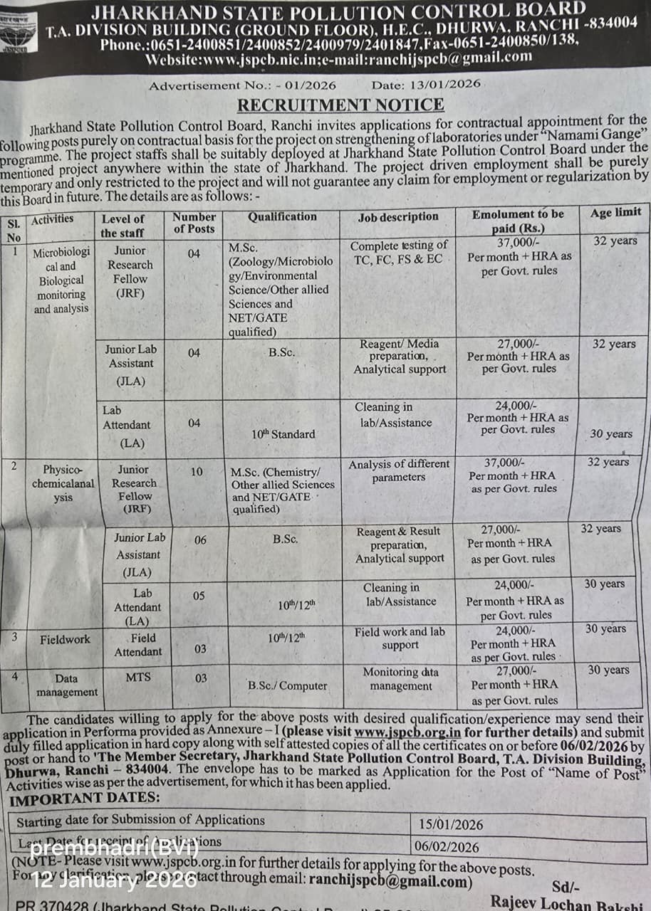 Jharkhand State Pollution Control Board (JSPCB) is a statutory organization responsible for monitoring and controlling pollution across the state of Jharkhand. The board works under various national environmental programs, including the Namami Gange Programme, focusing on strengthening laboratory infrastructure and environmental monitoring. JSPCB conducts scientific research, laboratory analysis, field surveys, and data management to protect water, air, and soil quality. The board regularly recruits skilled professionals on a purely contractual and project-based basis. These positions are temporary and limited to the project duration, without any claim for future regularization. JSPCB offers excellent exposure in environmental research, laboratory analysis, and fieldwork.