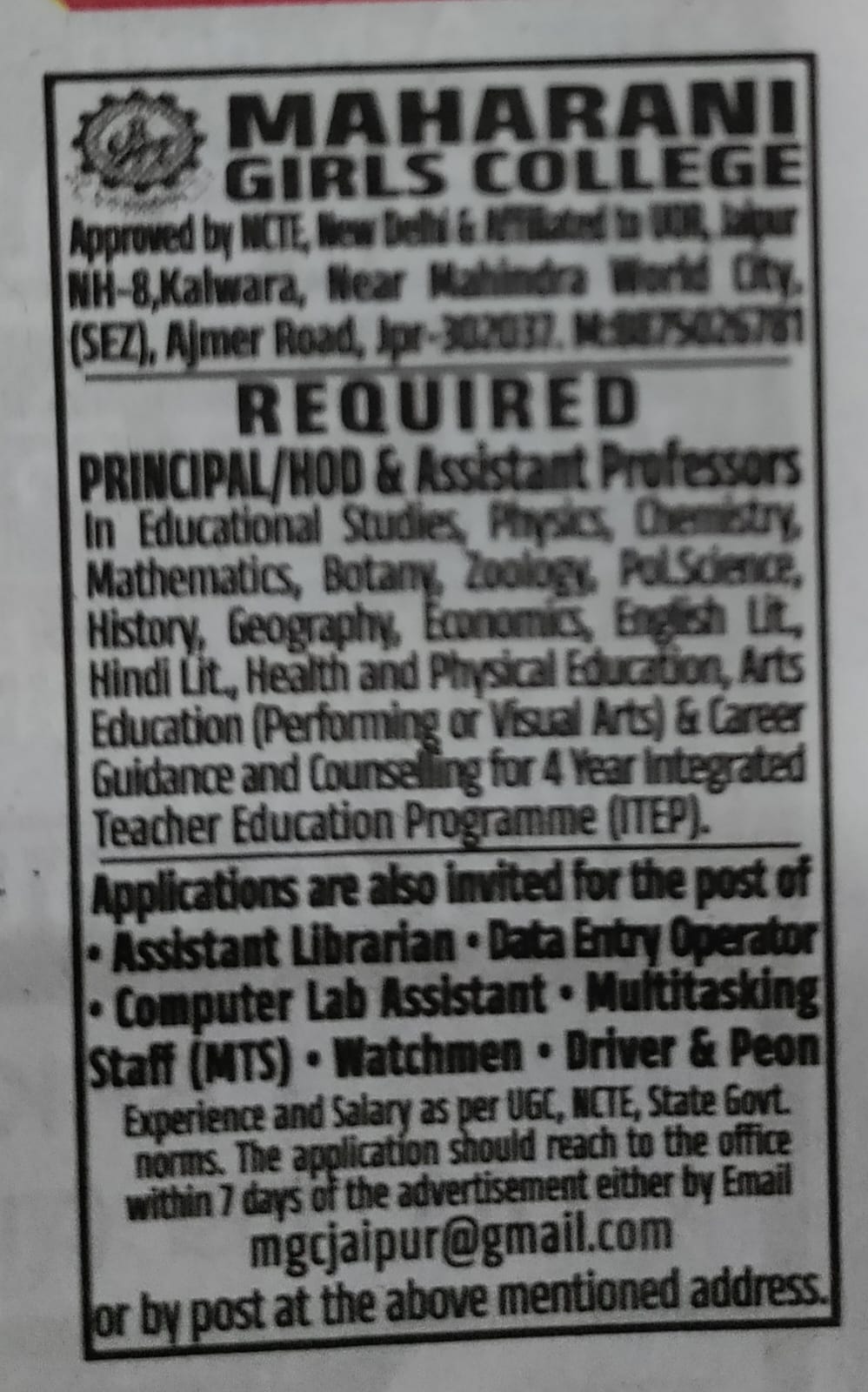 Maharani Girls College Jaipur invites applications for Principal, HOD, Assistant Professors, Assistant Librarian, Data Entry Operator, Computer Lab Assistant, MTS, Driver, Watchman & Peon posts. Check detailed eligibility, qualifications, and application process. Apply within 7 days!
