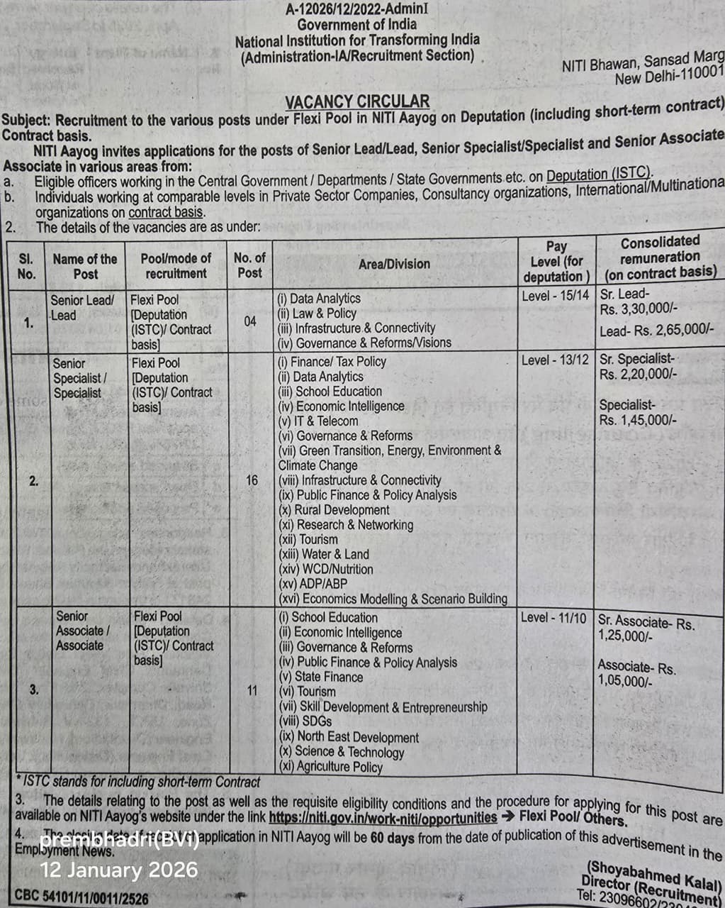 Apply for Senior Lead, Lead, Senior Specialist, Specialist, Senior Associate, and Associate posts in NITI Aayog Flexi Pool. Check vacancies, pay scale, eligibility, and important dates. Apply online before the last date for deputation/contract positions.