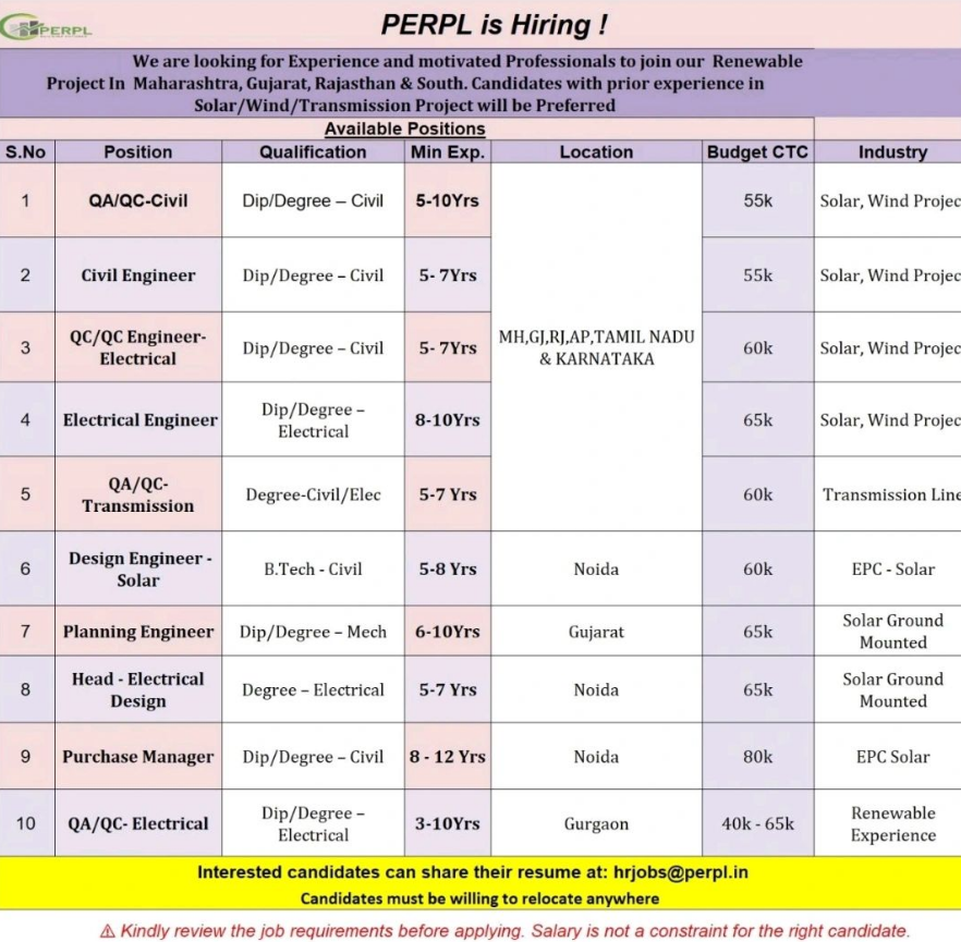 PERPL invites applications from experienced and motivated professionals to join its Renewable Energy Projects across Maharashtra, Gujarat, Rajasthan, South India, and PAN India locations.