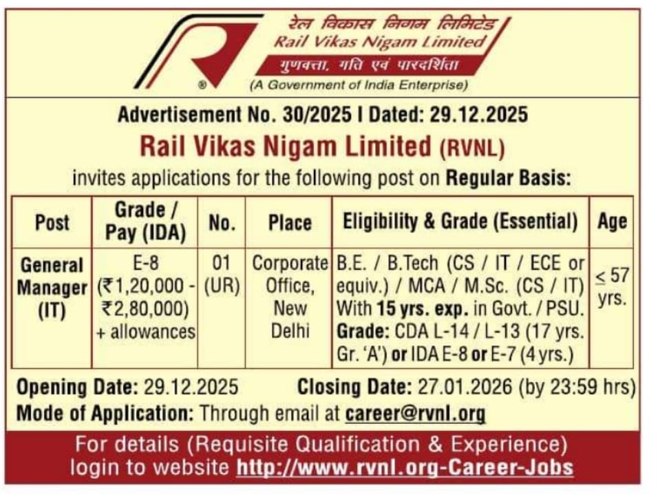 Rail Vikas Nigam Limited (RVNL), a Government of India Enterprise, has released an official notification inviting applications for the post of General Manager (IT) on a regular basis. Eligible and experienced candidates from Government / PSU background can apply through email mode.