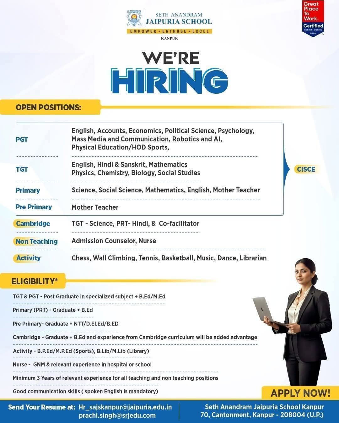 Seth Anandram Jaipuria School, Kanpur, a reputed institution known for academic excellence and holistic education, invites applications from qualified, experienced, and passionate educators and professionals for multiple Teaching, Non-Teaching, and Activity positions for the upcoming academic session 2026–27.