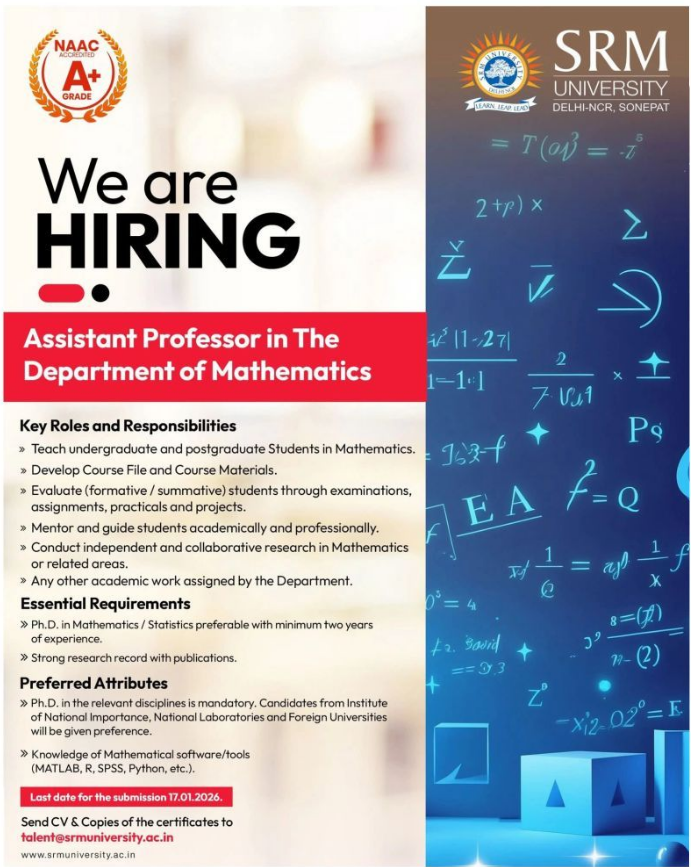 SRM University Delhi-NCR, Sonepat invites applications for Assistant Professor in Mathematics. Check eligibility, qualification, last date, and application process.