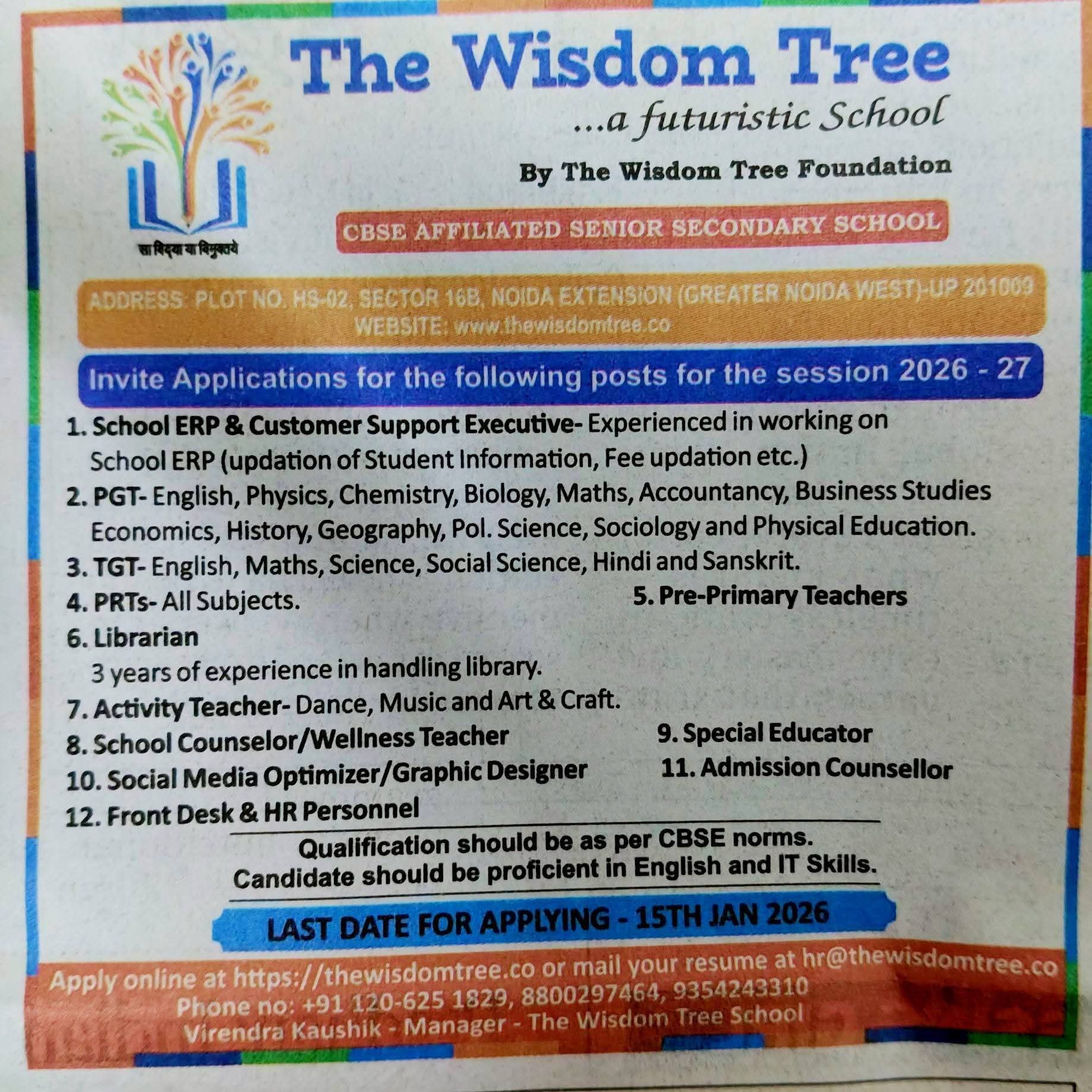 The Wisdom Tree School, Greater Noida West, invites applications for Teaching and Non-Teaching posts for session 2026–27. CBSE affiliated school vacancies for PGT, TGT, PRT, Librarian, Counselor, ERP Executive and more. Apply before 15 January 2026.