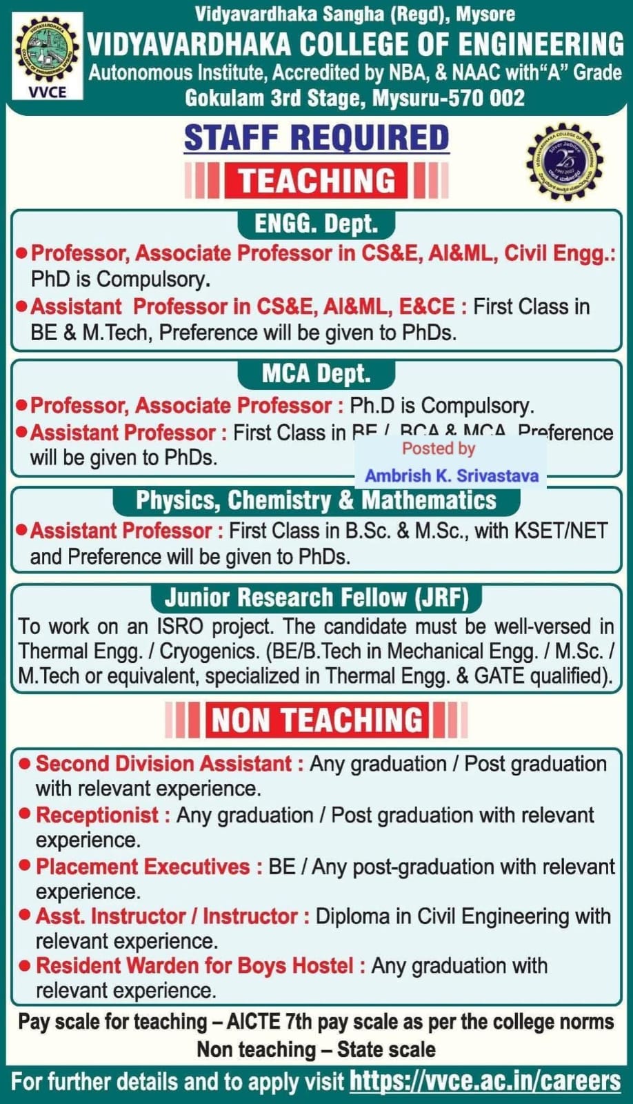 Vidyavardhaka College of Engineering Recruitment 2026 | Teaching & Non-Teaching Jobs